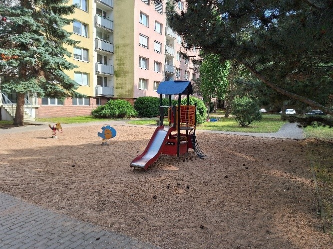 Doplnění stávajícího děstského hřiště o nízké oplocení a herní prvek závěsné houpačky pro 2 děti. Oplocení je požadováno z důvodu bezpečnosti pohybu dětí v návaznosti na frekventovanou vnitroblokovou komunikaci (parkující vozy a zásobování obchodů a služeb). Původní houpačku zničili vandalové. Pro aktivity dětí je herní prvek závěsné houpačky velmi atraktivní a žádaný. Ideálním řešením by byl herní prvek pro malé i velké děti tj. závěsný košík pro malé děti a závěsný sedák pro větší děti.